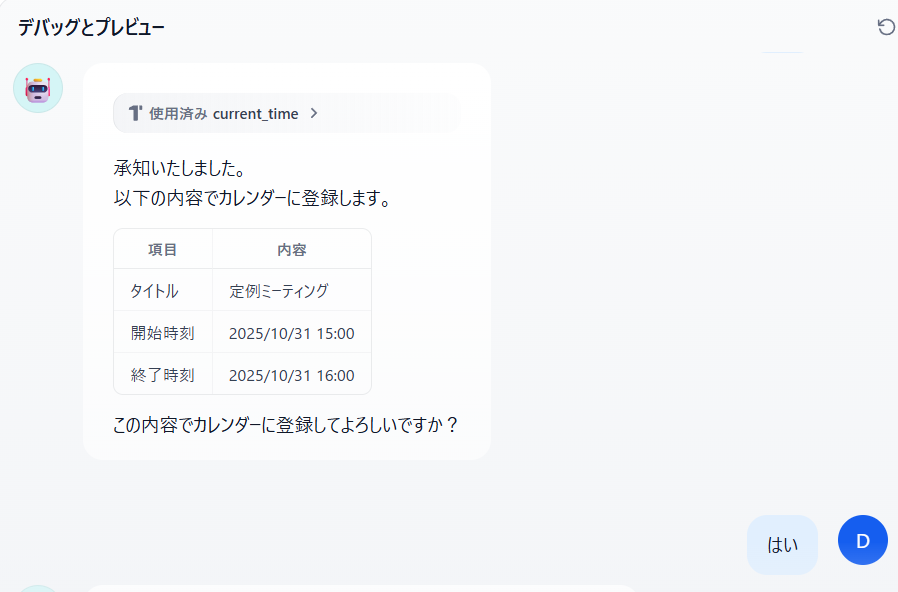 以上の手順を踏むと、あなただけのAI秘書が完成します。それでは、実際に完成したAI秘書の動作を確認してみましょう。