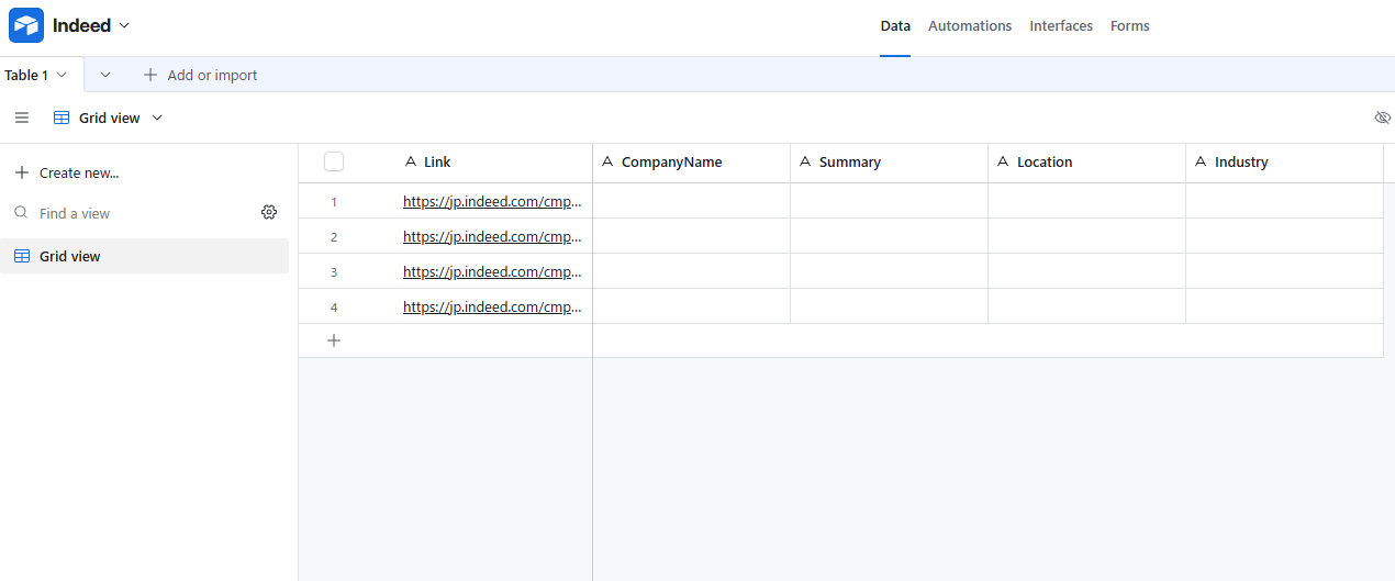 4.作成した「Link」フィールドに、調査対象となるIndeedの企業ページのURLを一行ずつ貼り付けます。