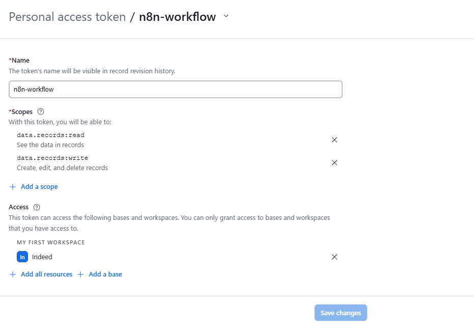 ・Access:「Add a base」ボタンから先ほど作成した「Indeed」ベースを選択