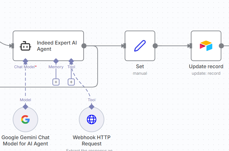 Name:companyName Value:{{ $(‘Indeed Expert AI Agent’).item.json.output.companyName }} Name:summary Value:{{ $(‘Indeed Expert AI Agent’).item.json.output.summary }} Name:location Value:{{ $(‘Indeed Expert AI Agent’).item.json.output.location }} |