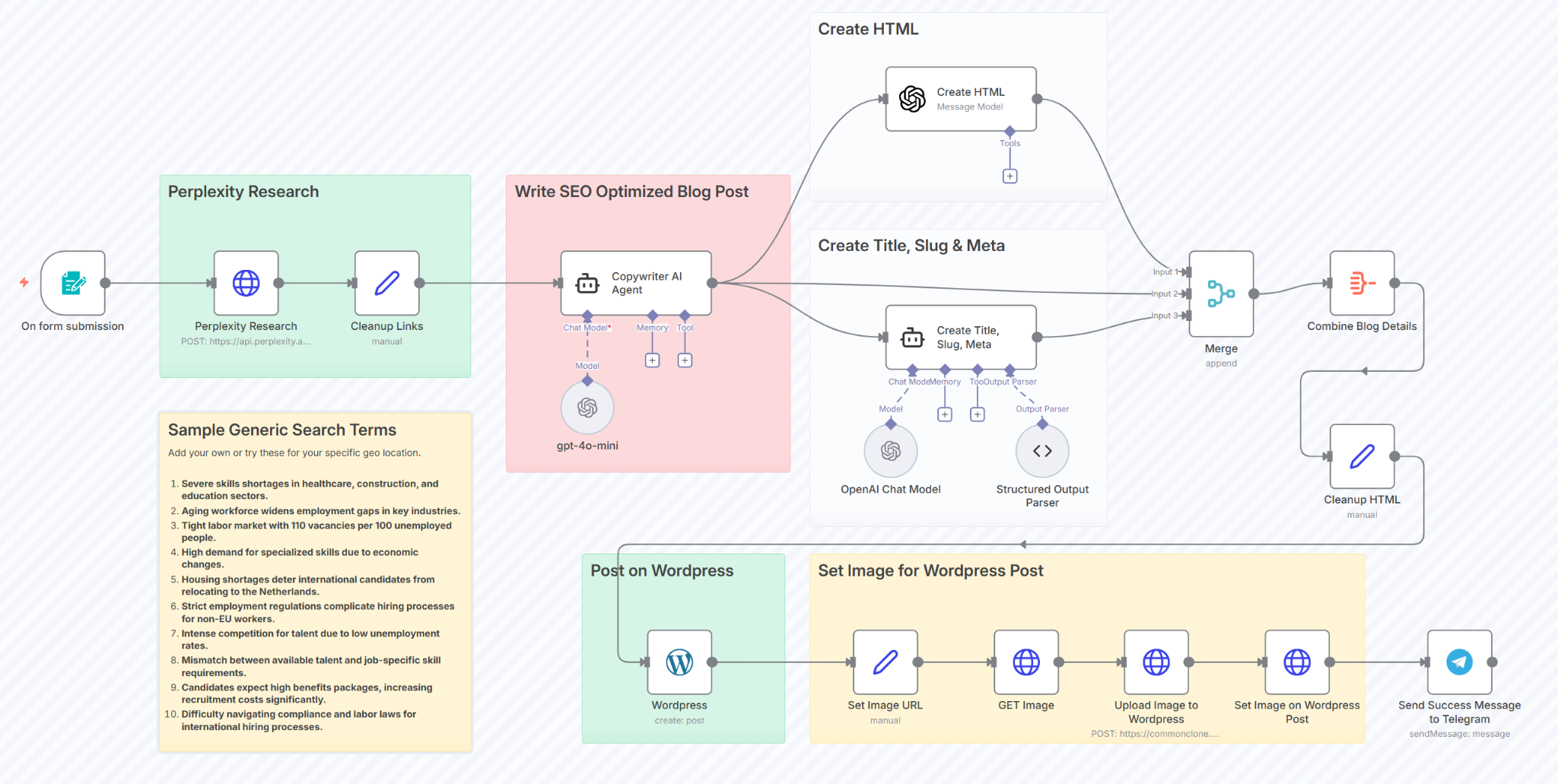 このワークフローは、まずユーザーが入力した記事のテーマを受け取ります。次に、Perplexity AIがそのテーマに対して情報収集を行い、収集されたデータを基に、ChatGPTがSEOに最適化されたブログ記事を作成します。