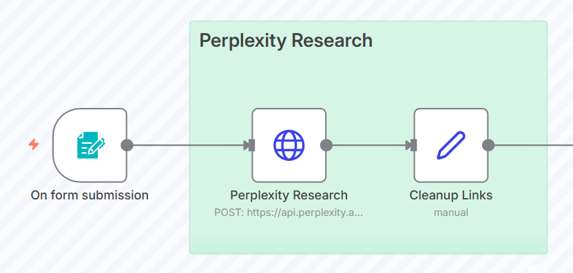 Perplexity AIは、与えられたクエリに対して多角的な情報源からデータを抽出し、要約する能力に優れています。「On Form Submission」ノードから渡された記事テーマを使って、記事執筆に必要な背景情報、統計データ、事実などを効率的に収集するよう設定します。