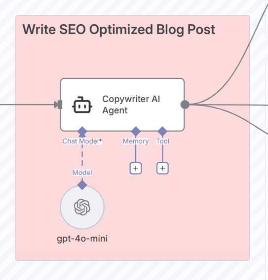 収集・整理された情報を基に、SEOガイドラインに沿ったブログ記事の草案をAIが生成します。このノードはOpenAIのモデルを活用し、前のステップで準備された情報から記事本文を作成します。このノードを使用するにはOpenAIのAPIキー設定が必要です。