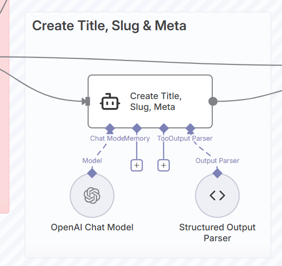 AIの出力は自由なテキスト形式であるため、このノードを用いて、特定の情報(例:title、 slug、meta)を正確に抽出し、JSONオブジェクトとして整形します。主に、出力されるテキストの正規表現やJSONスキーマを設定してパースを行います。