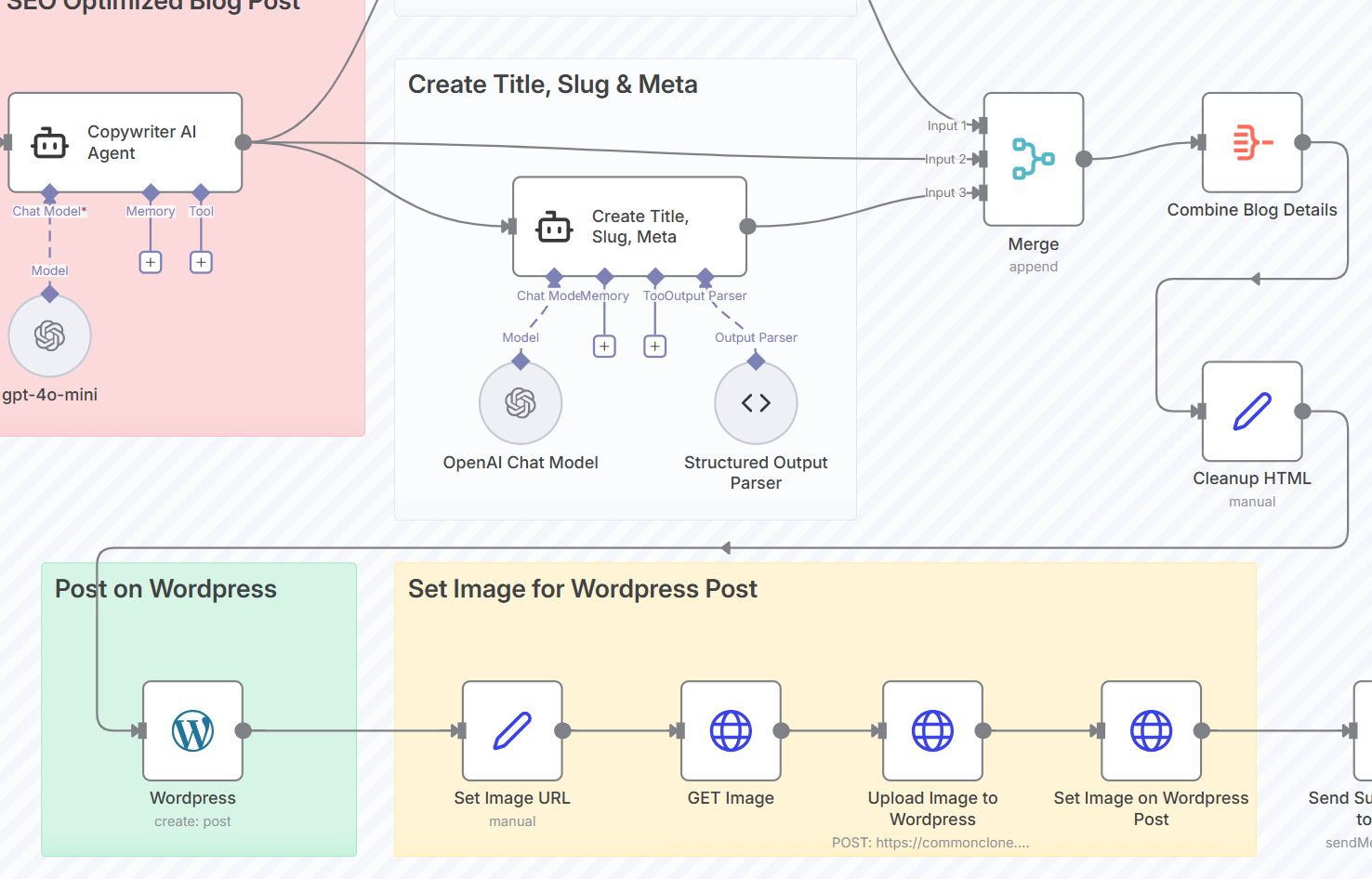 記事に魅力的なアイキャッチ画像を自動で設定する一連のプロセスです。「Set Image URL」ノードで、記事のアイキャッチとして使用する画像のURLを指定します。