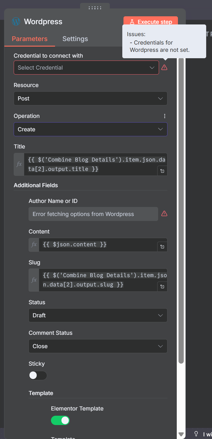 このノードを使用するには、WordPressサイトの認証情報(アプリケーションパスワードなど)と投稿先のURLを事前に設定し、statusパラメータを「draft(下書き)」に設定する必要があります。