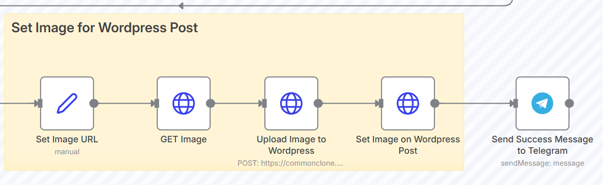 次に「GET Image」ノードでその画像をダウンロードし、「Upload Image to WordPress」でWordPressのメディアライブラリにアップロードします。