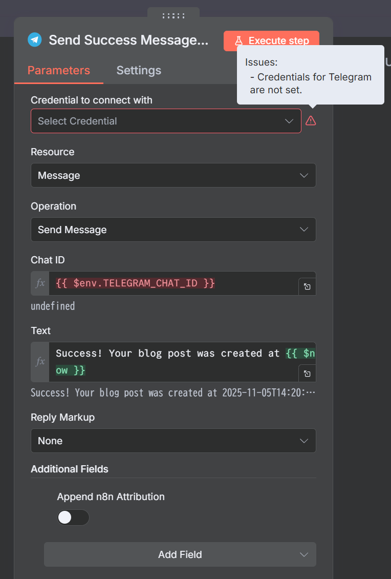 記事の自動生成とWordPressへの投稿が完了したことを、Telegramを通じて運用担当者へリアルタイムで通知します。ワークフローの最終段階として、処理が成功したことを示すメッセージをTelegramボット経由で、指定されたチャットIDに送信します。