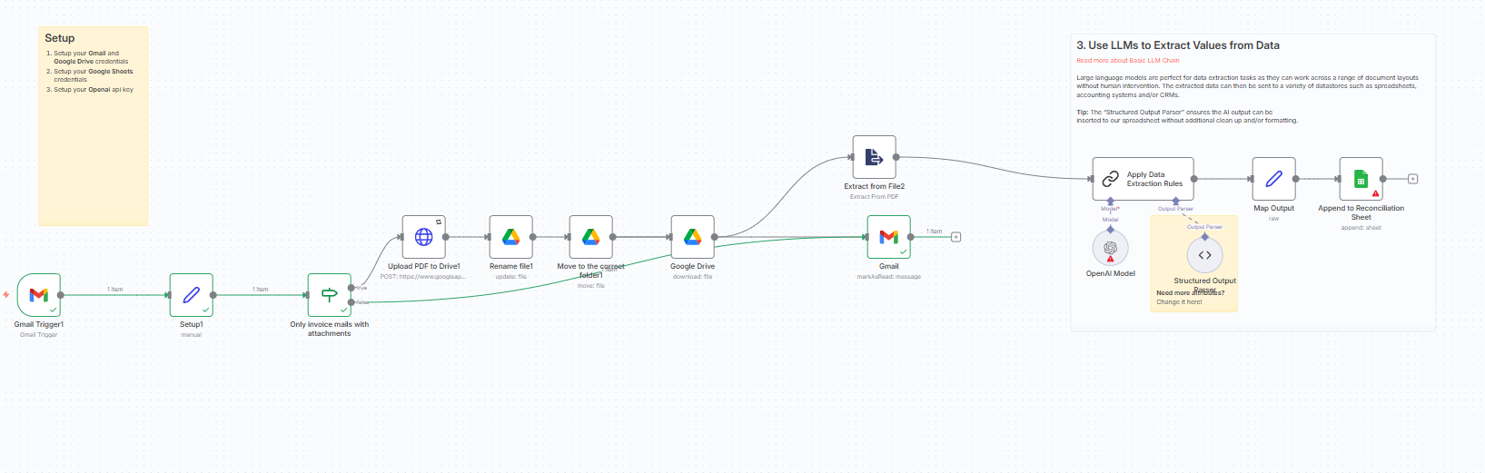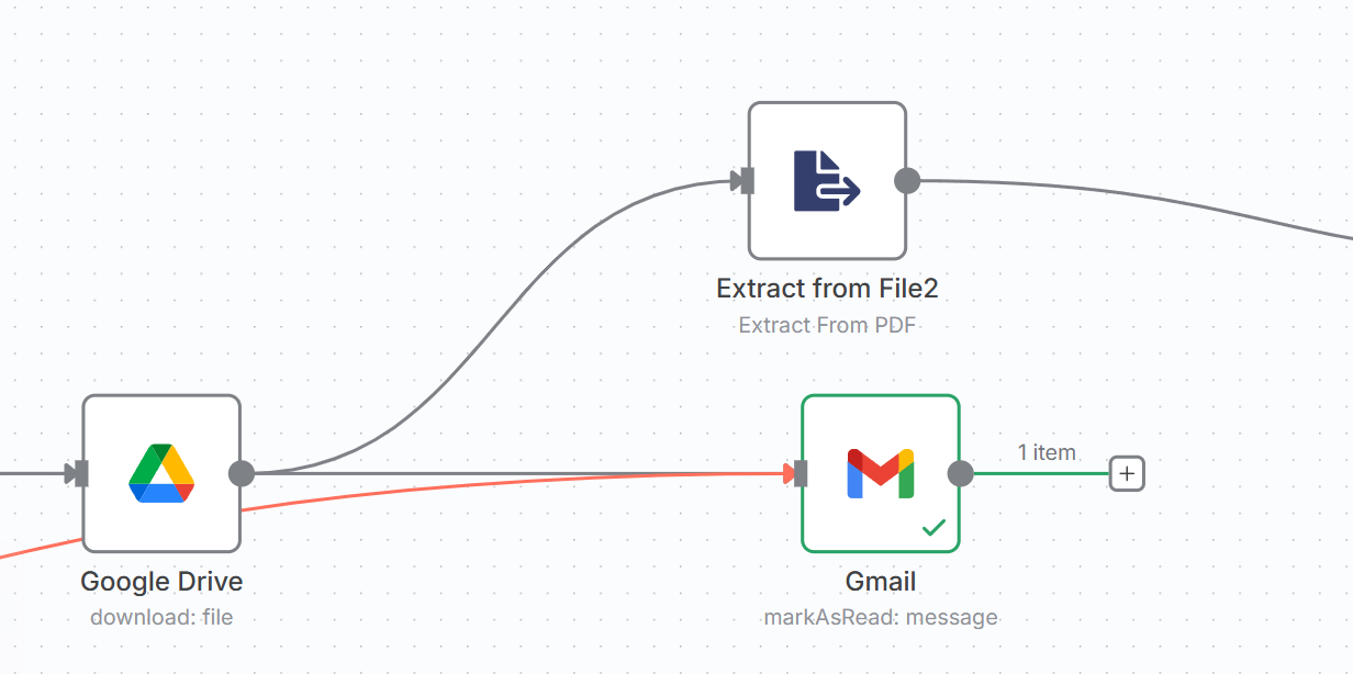 この2つのノードは一連の処理として機能します。まずGoogle Driveから整理済みのPDFをn8nに再度ダウンロードし、次に「Extract from Fileノード」がPDFからプレーンテキスト情報を抽出します。