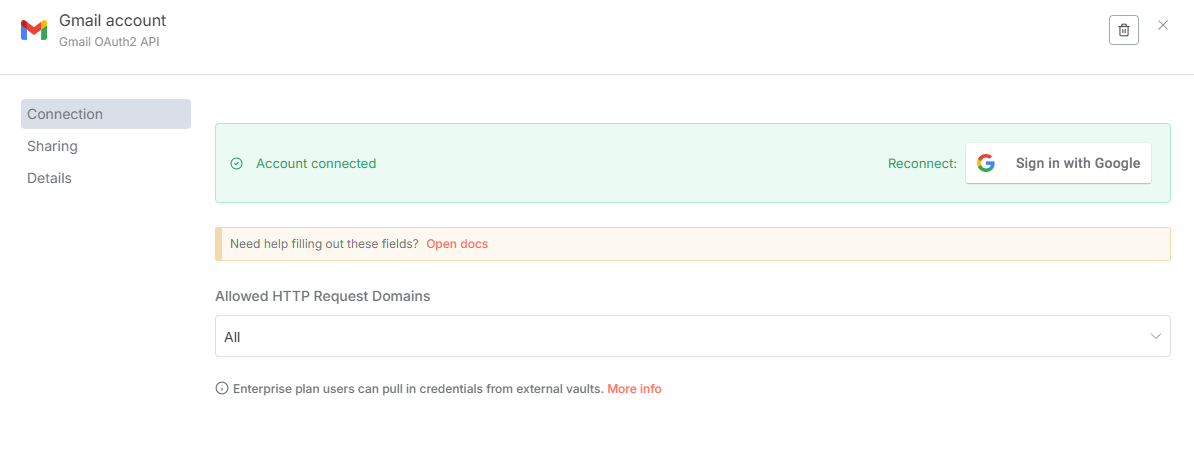 全自動化プロセスの起点です。Gmail APIを介して定期的にメールボックスを監視し、「未読の受信トレイに新規メールが到着した」というイベントを検知した際に、後続のノードへメールデータを渡し、ワークフロー全体を起動します。連携する予定のGoogleアカウントでログインすることで設定が完了します。
