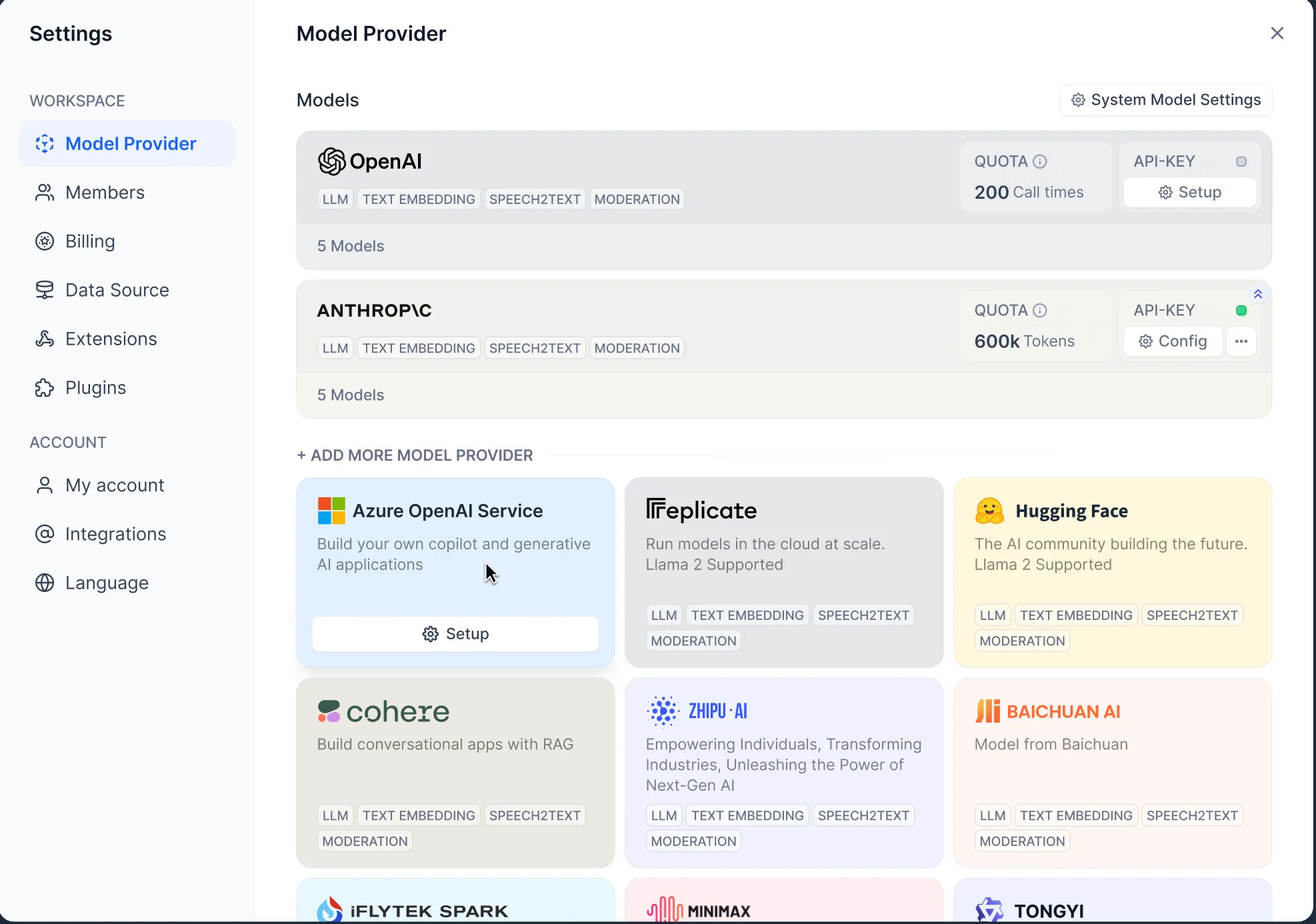 ただし、GPT-4oやClaude3など外部モデルを利用する場合は、各社の有料APIキーが必要です。Difyの無料枠だけでは使用できないモデルもあるため、事前にAPIキーを取得して設定してください。