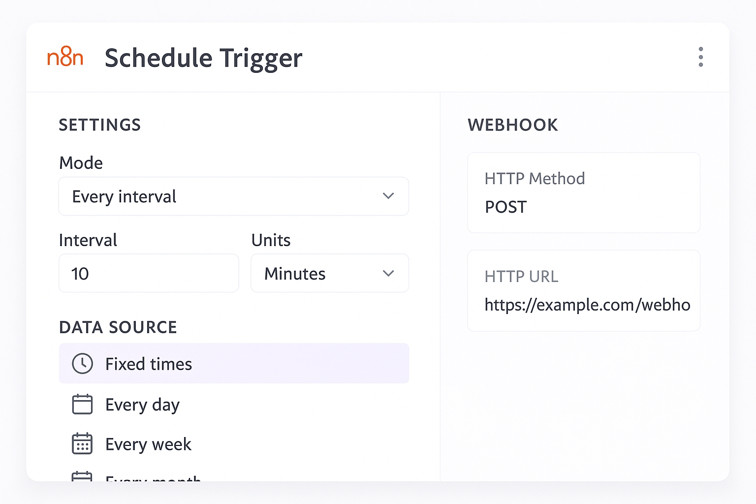 投稿のネタとなる情報を自動で集める仕組みを作ります。まずは、ワークフローが動き出すきっかけとなる「トリガー」を設定しましょう。「Schedule」トリガーを使用すれば、毎日決まった時間や特定の曜日に自動で処理を開始させられます。