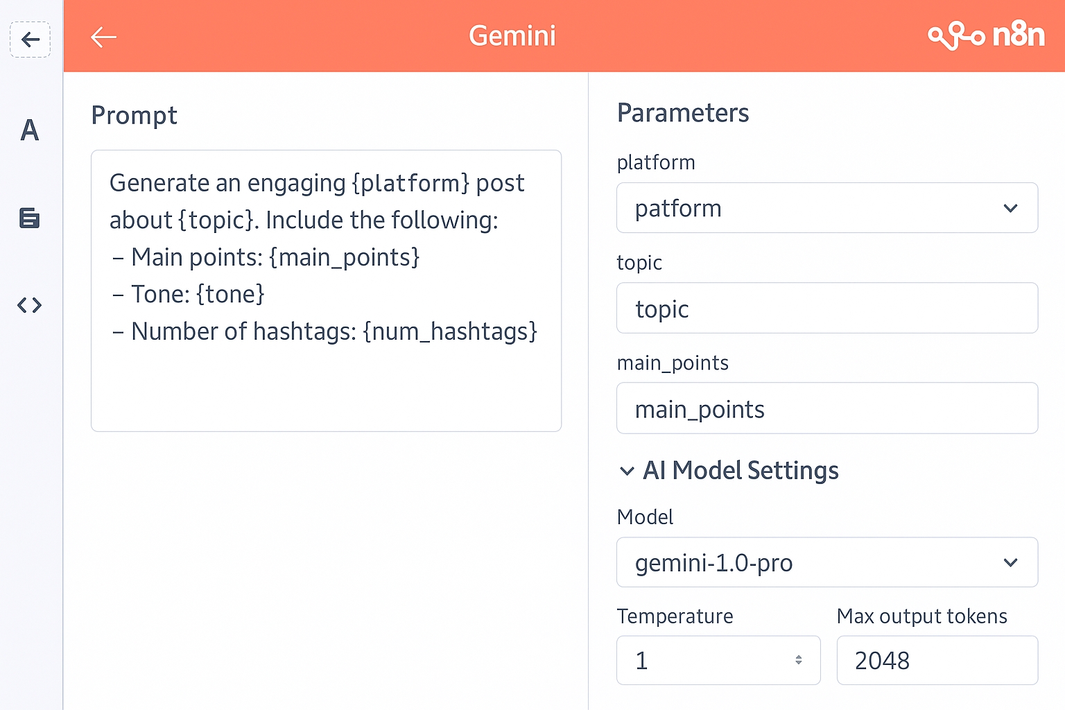 収集した情報を基に、Geminiが投稿文を作成する工程です。「Google Gemini (Chat Model)」ノードを配置し、前のノードから受け取ったニュース記事のタイトルや本文を、プロンプト(指示文)に組み込みます。