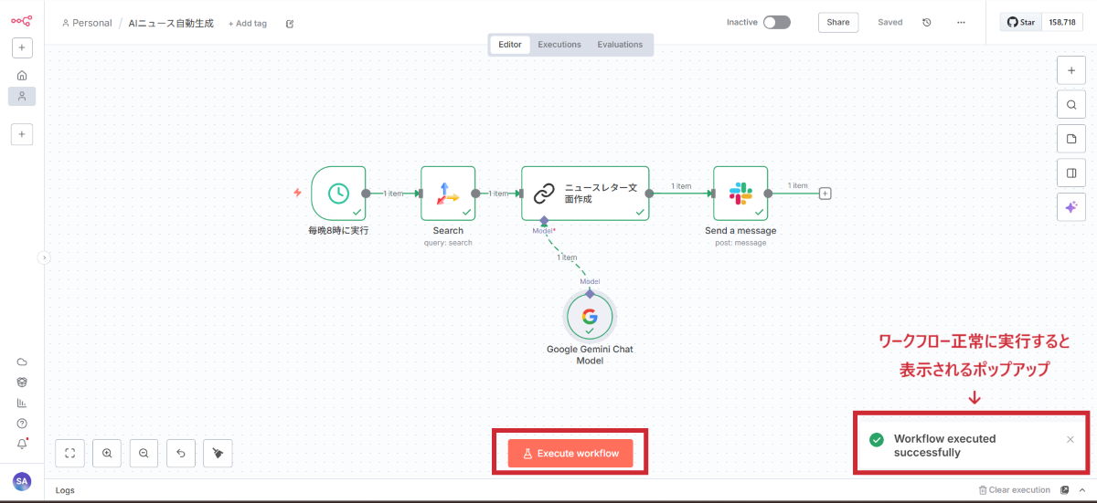すべての設定が完了したら、ワークフローをテスト実行し、有効化します。