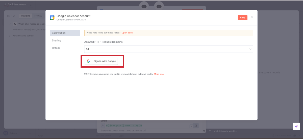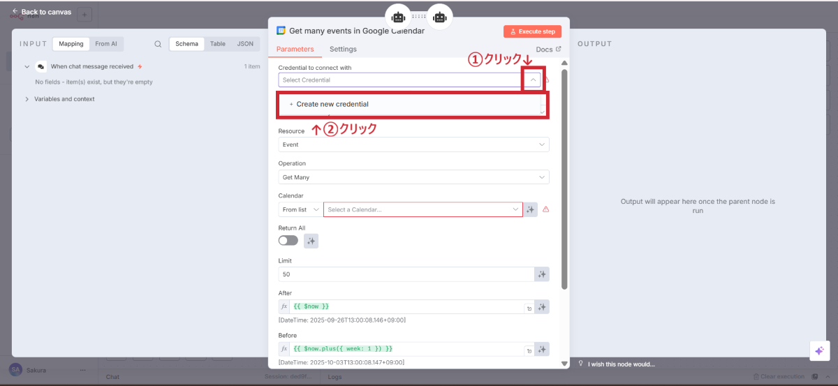 1と2は実質的に同じGoogleアカウントを使用します。つまり、Googleアカウントがn8nと連携されており、そのアカウントのGoogleカレンダーに予定が入力されていればOKです。テスト用の架空の予定でも問題ありません。