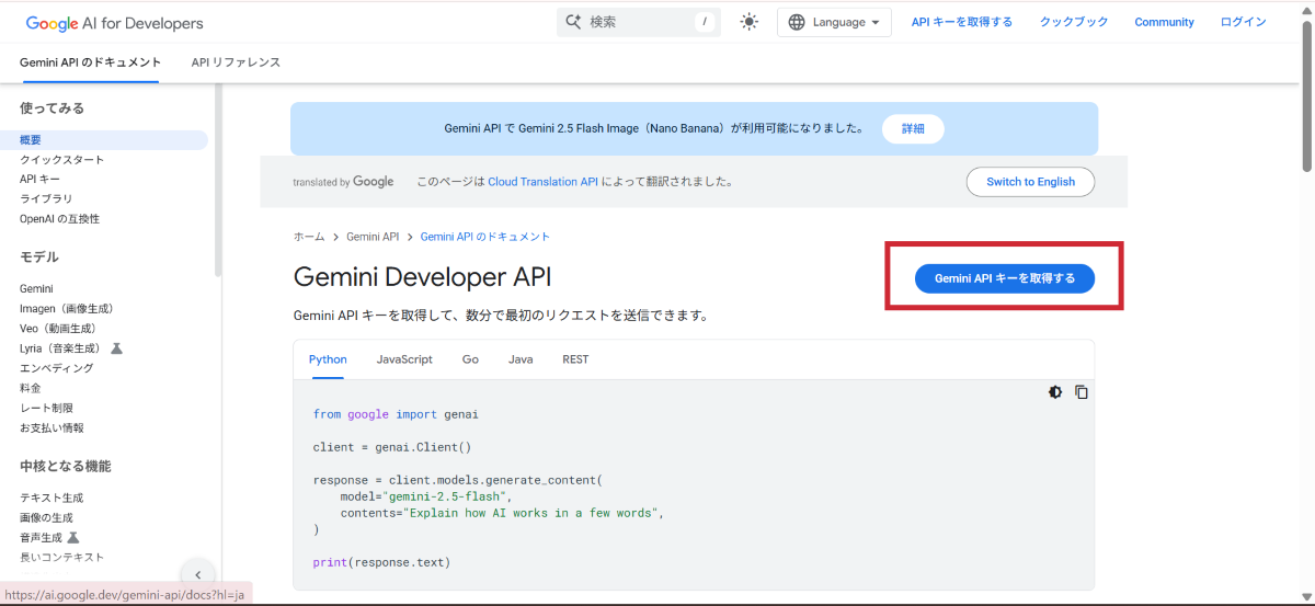 1. Gemini APIサイトhttps://ai.google.dev/gemini-api/docs?hl=jaにアクセス