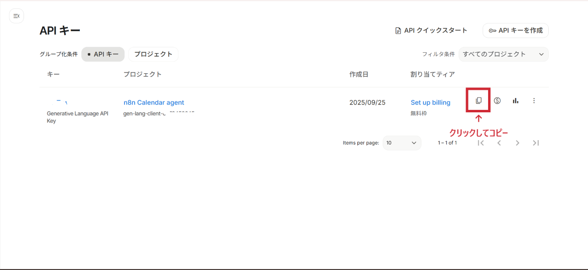 1. 発行されたAPIキーをコピーし、パスワード管理ツールなど、安全な場所に保管します。