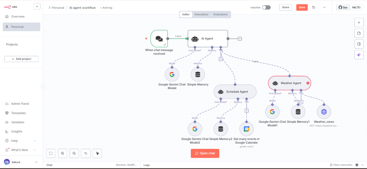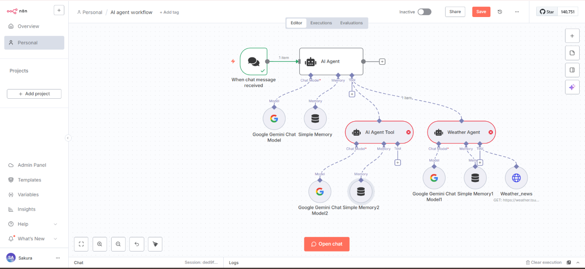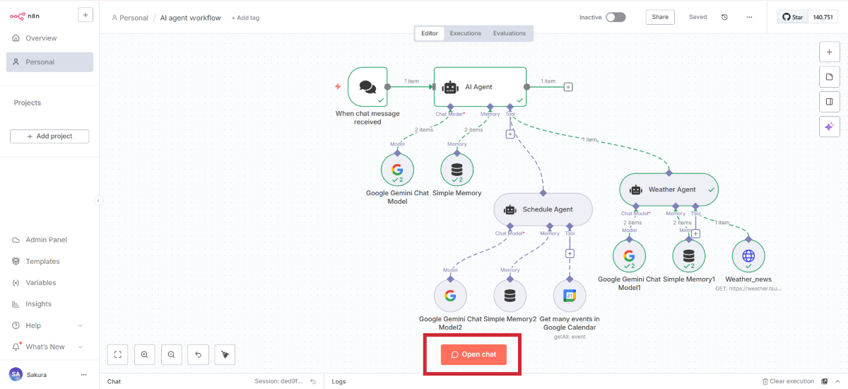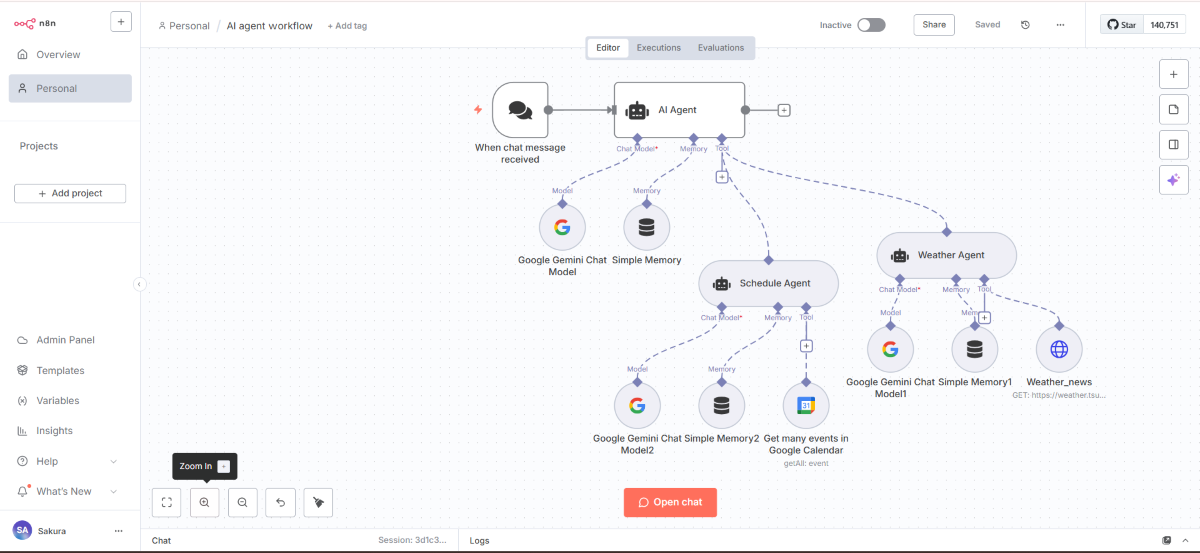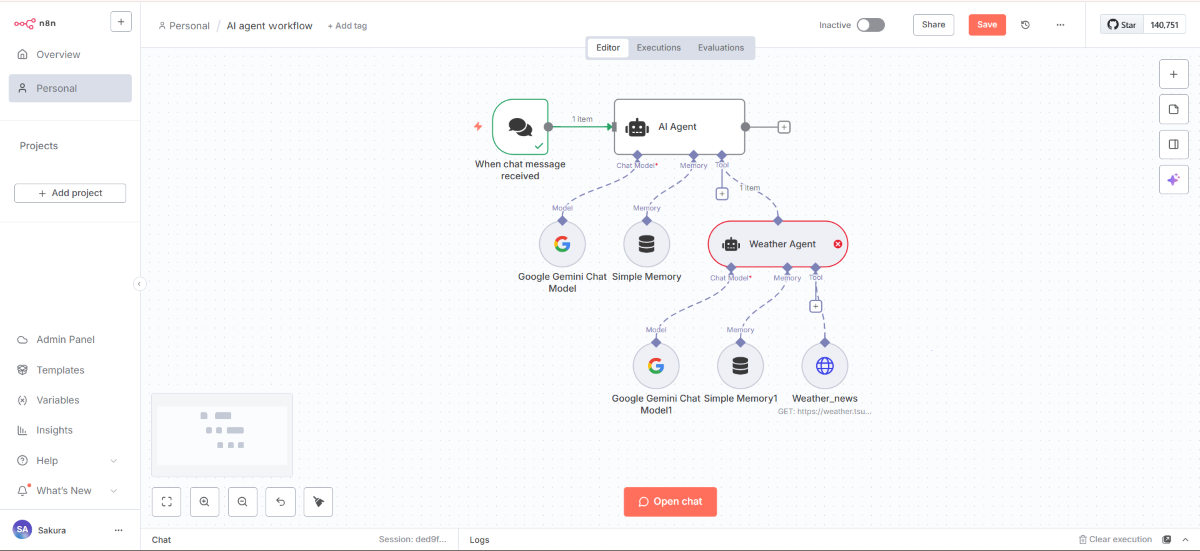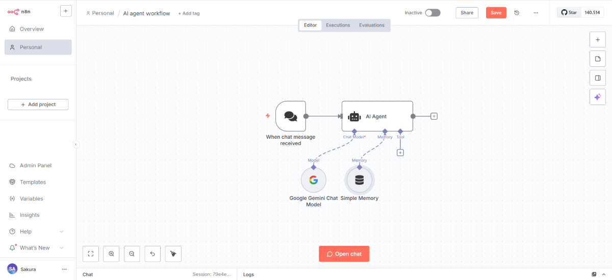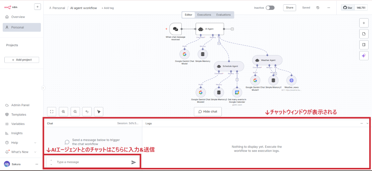 この章では、実際にn8n上でAIエージェントのワークフローを構築していきます。5つのステップに分けて、順番に設定を進めていきます。完成すると、以下のような構成のシステムが出来上がります。