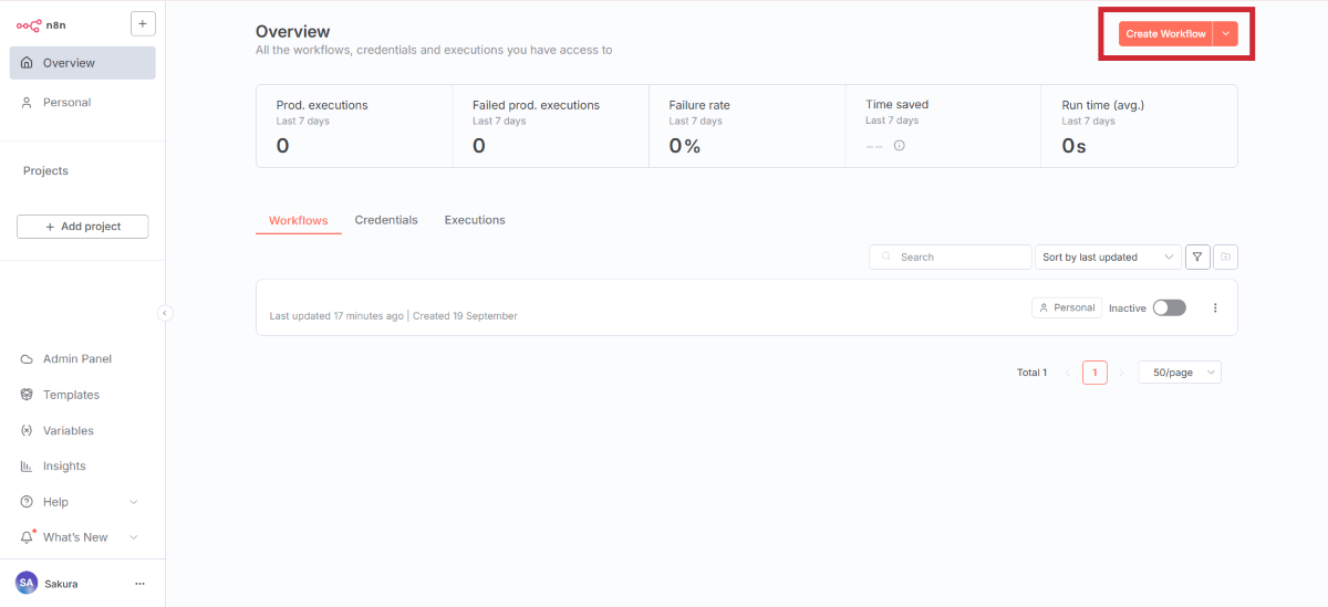 1. n8nのホーム画面で「Create Workflow」をクリック