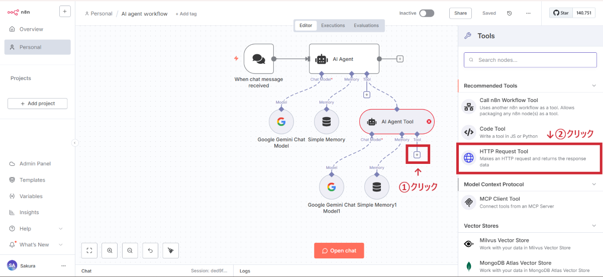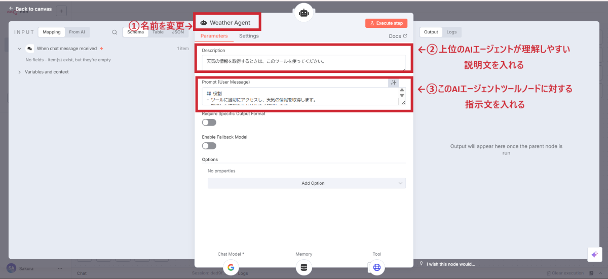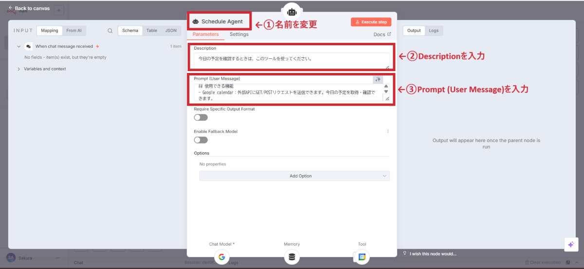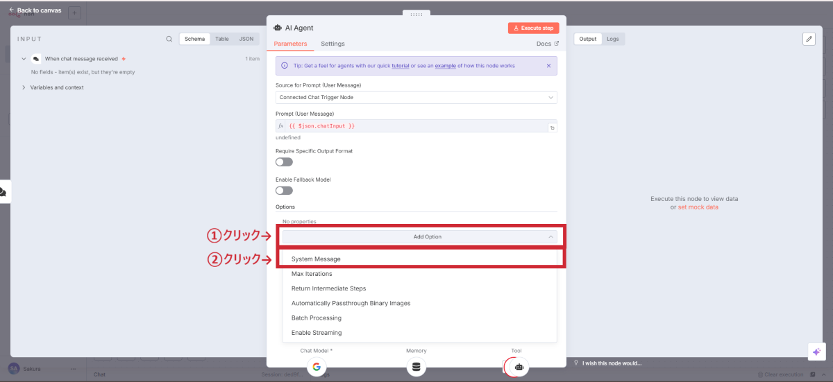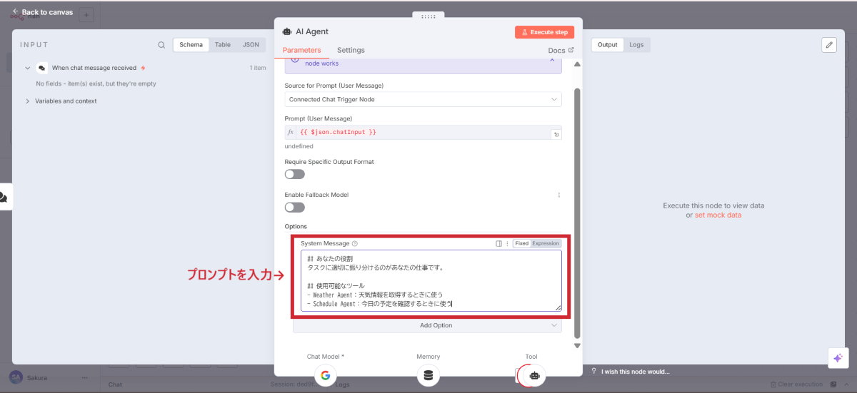 最初に、システムの中核となる「AIエージェントノード」を配置します。このノードが全体の司令塔として、ユーザーからの質問を理解し、適切なツールに作業を振り分ける役割を担います。