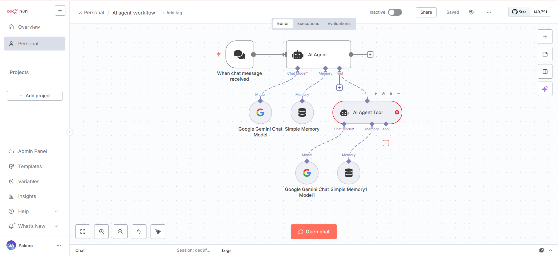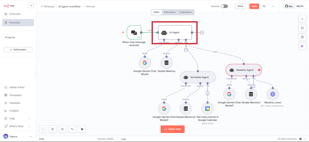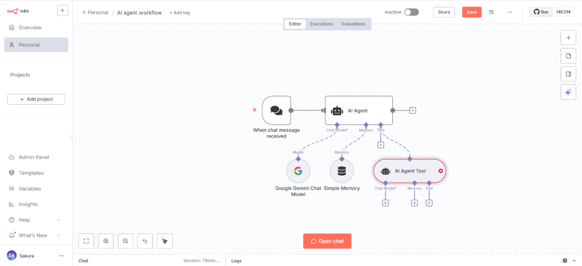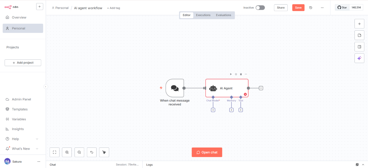 最初に、システムの中核となる「AIエージェントノード」を配置します。このノードが全体の司令塔として、ユーザーからの質問を理解し、適切なツールに作業を振り分ける役割を担います。
