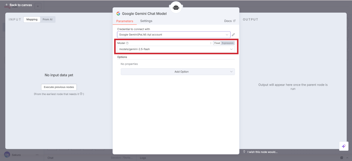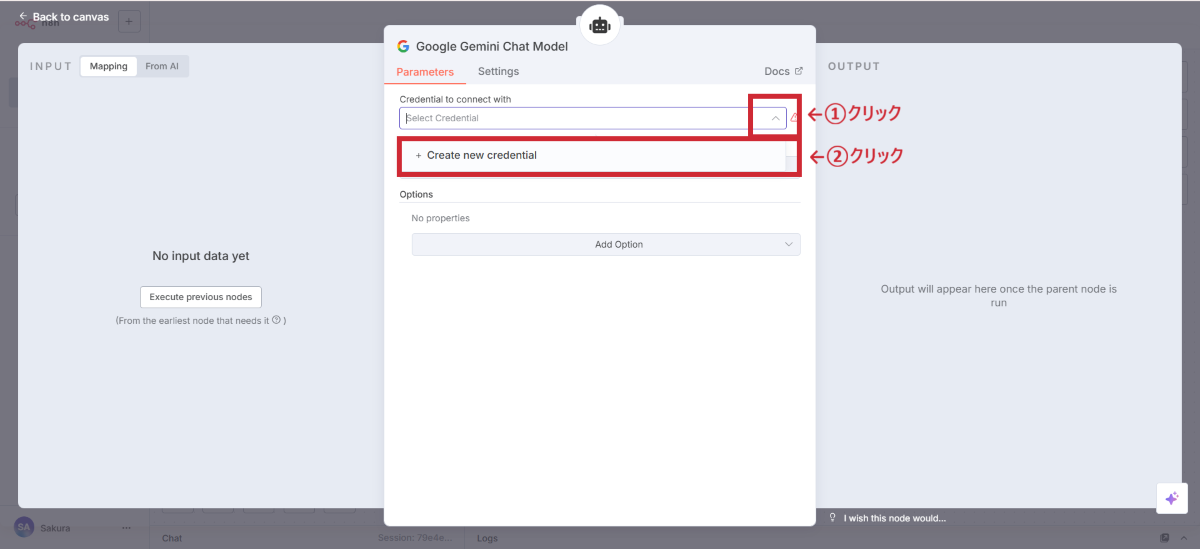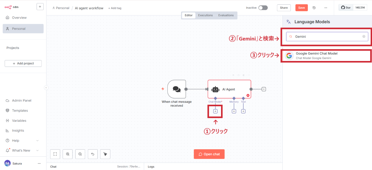 • AIエージェントノード下部の「Chat Model」分岐先の「+」をクリック
