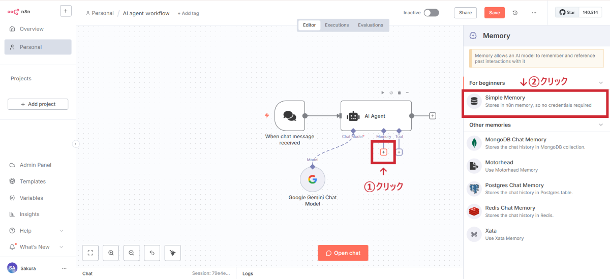 • AIエージェントノード下部の「Memory」分岐先の「+」をクリック