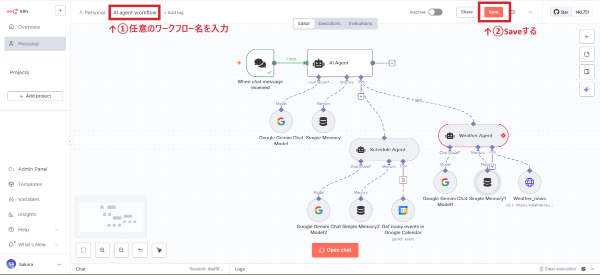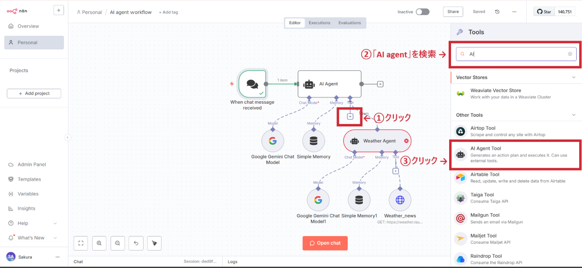 STEP1 n8nのシステムの中核となるAIエージェントノードを追加