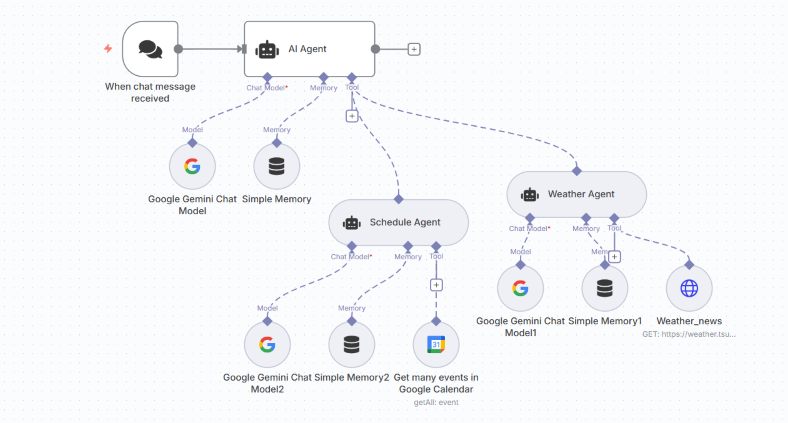 完成後のワークフロー全体図。各ノードが連携してAIエージェントとして機能します