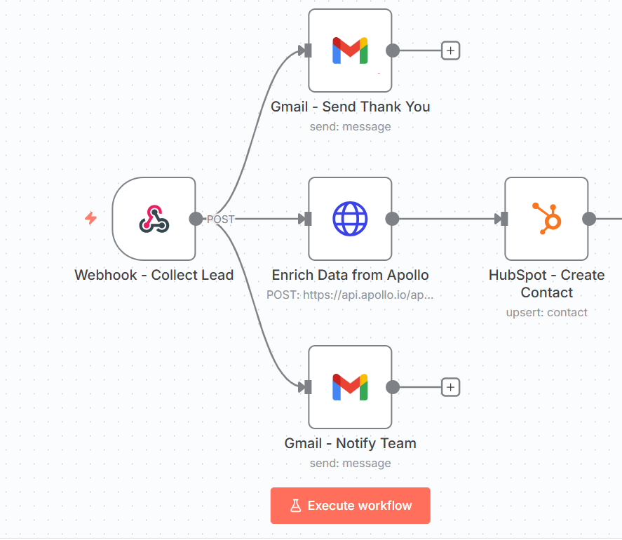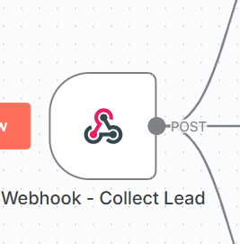 このプロセスにおいて使用する主要なノードは「Webhook – Collect Lead」です。このノードは、フォーム送信後にリード情報を受け取り、後続処理を開始するためのトリガーとなります。