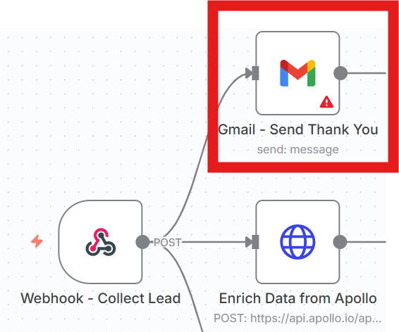 サンクスメールの送信に用いるノードは「Gmail – Send Thank You」です。このノードは、受け取ったリードのメールアドレス宛てにパーソナライズされたお礼メールを即座に送信します。メールテンプレートに動的変数を組み込むことで、個別の対応が可能となり、顧客に対してさらに効果的な印象を与えられます。