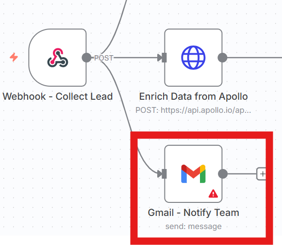 このプロセスで使用する主要なノードは「Gmail – Notify Team」です。このノードは、指定したチームメンバーに新着リードの情報を含む通知メールを自動的に送信する役割を果たします。