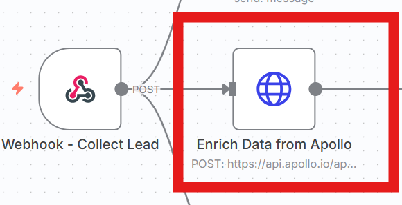 このプロセスでは、「Enrich Data from Apollo(HTTP Request)」ノードが使用されます。このノードは、Apollo APIと連携し、リードの基本情報(例えば、メールアドレス)を元に、そのリードに関連する詳細情報を取得可能です。