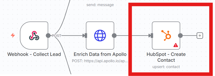 HubSpotへの自動登録で使用するノードは「HubSpot – Create Contact(HubSpot)」です。このノードは、エンリッチメントされたリード情報をHubSpotに自動的に登録する役割を果たします。