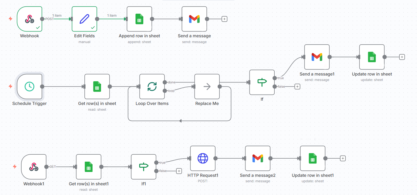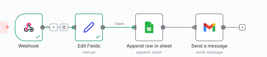 最初のステップとして、Google Formsに申し込みがあった瞬間に内容を記録し、受付完了メールを自動送信する仕組みを構築します。ここではn8nのWebhook機能を使い、Googleフォームからの送信を即座に検知します。