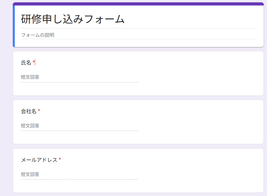 研修の申込フォームを作成します。今回はシンプルに以下の3項目とします。
