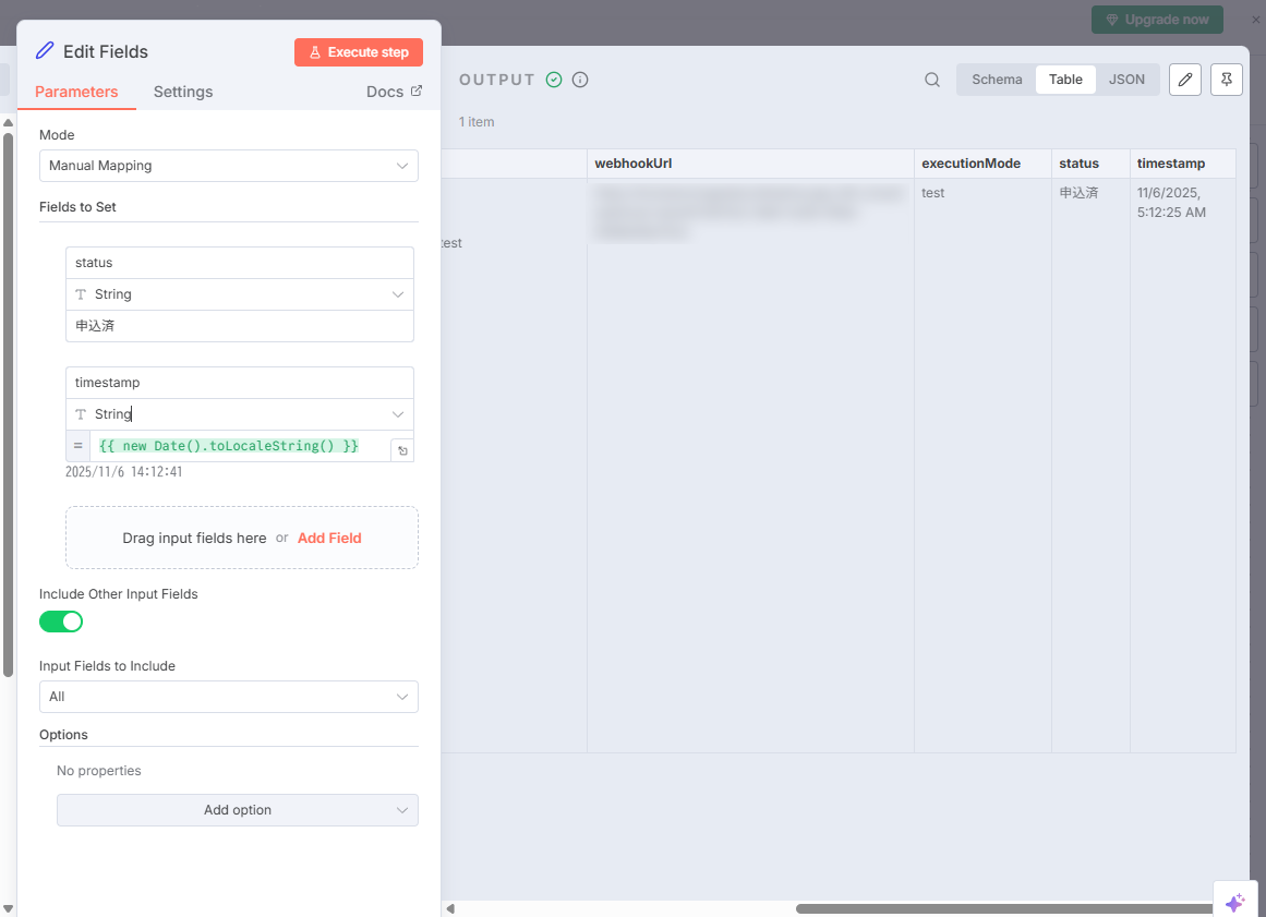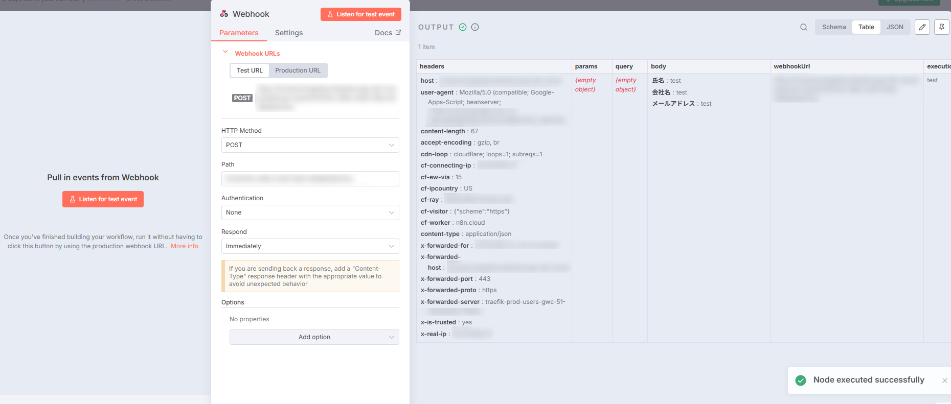 8.n8nの画面に戻ると、Webhookノードがデータを受信し、成功表示に変わります。これで連携は完了です。