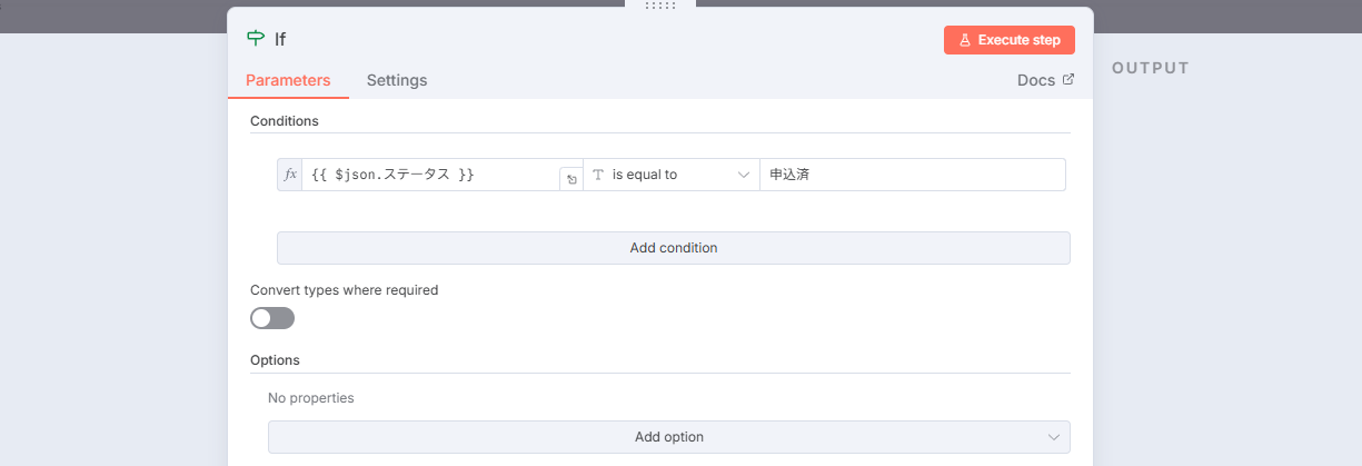 「ステータスが “申込済”」の参加者だけを次の処理へ進ませます。IFノードを追加し、下記設定を行います。