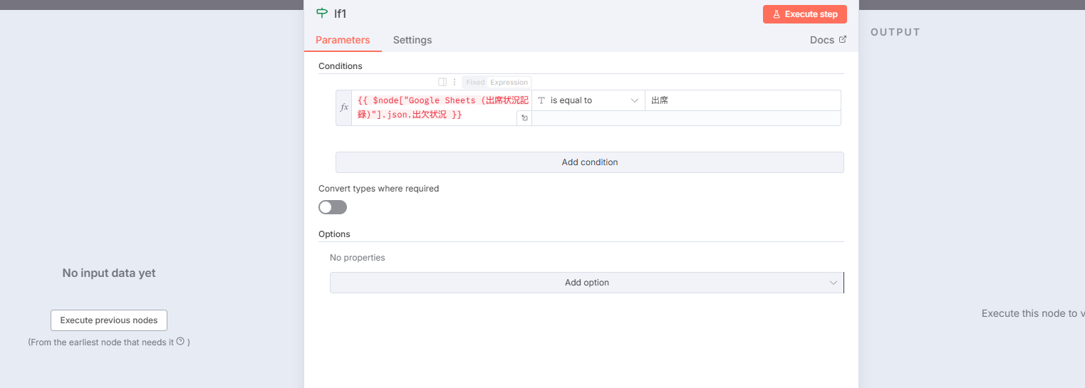 ・Value 1:{{ $node[“Google Sheets (出席状況記録)”].json.出欠状況 }}