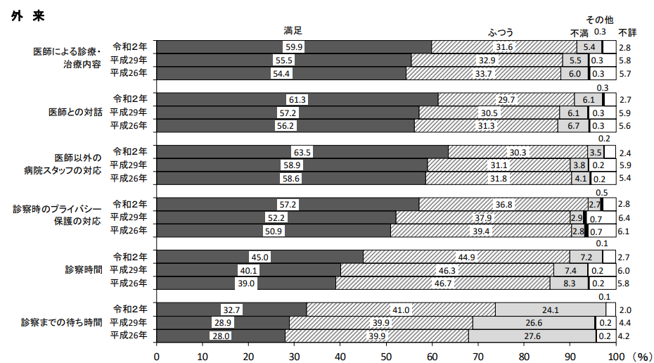 厚生労働省の調査では、外来受診時の不満として「診察までの待ち時間」が最も多く挙げられていました。