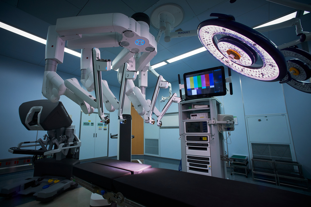 手術支援ロボットのダヴィンチにより、傷口を小さく留めた手術が可能となり、患者さんの出血量を減らせます。手術後の痛みが少なく、回復も早いため、早期の社会復帰が期待できる最先端のIoT活用事例です。