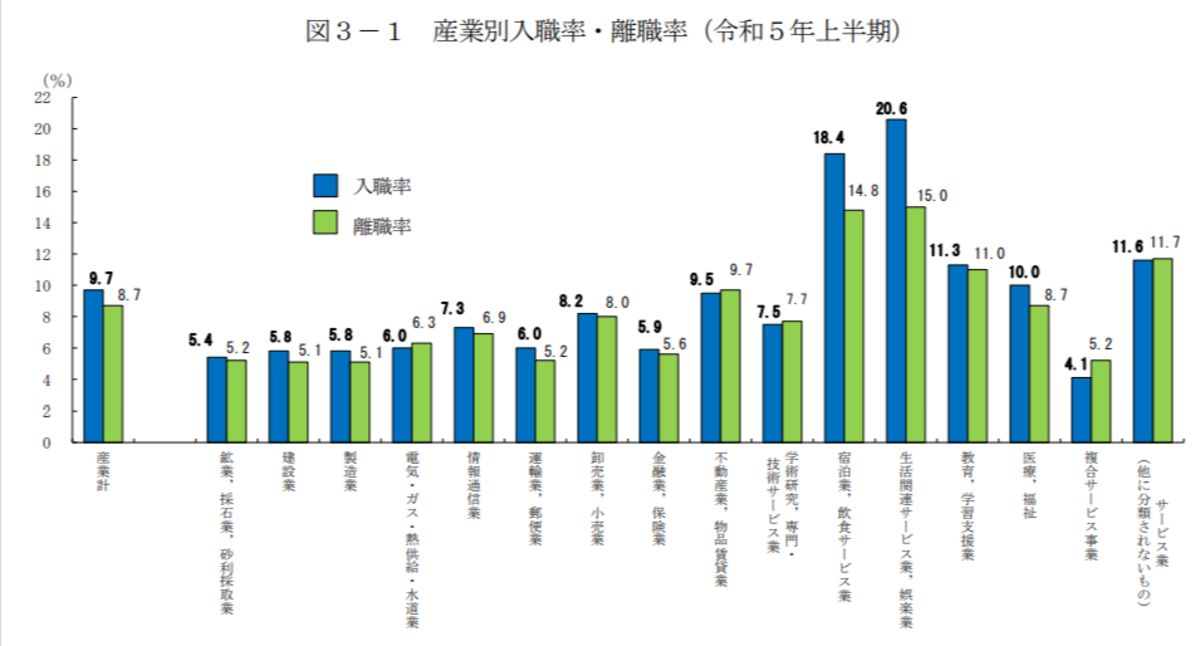 引用元:厚生労働省 令和5年上半期雇用動向調査結果の概要 産業別の入職と離職の状況