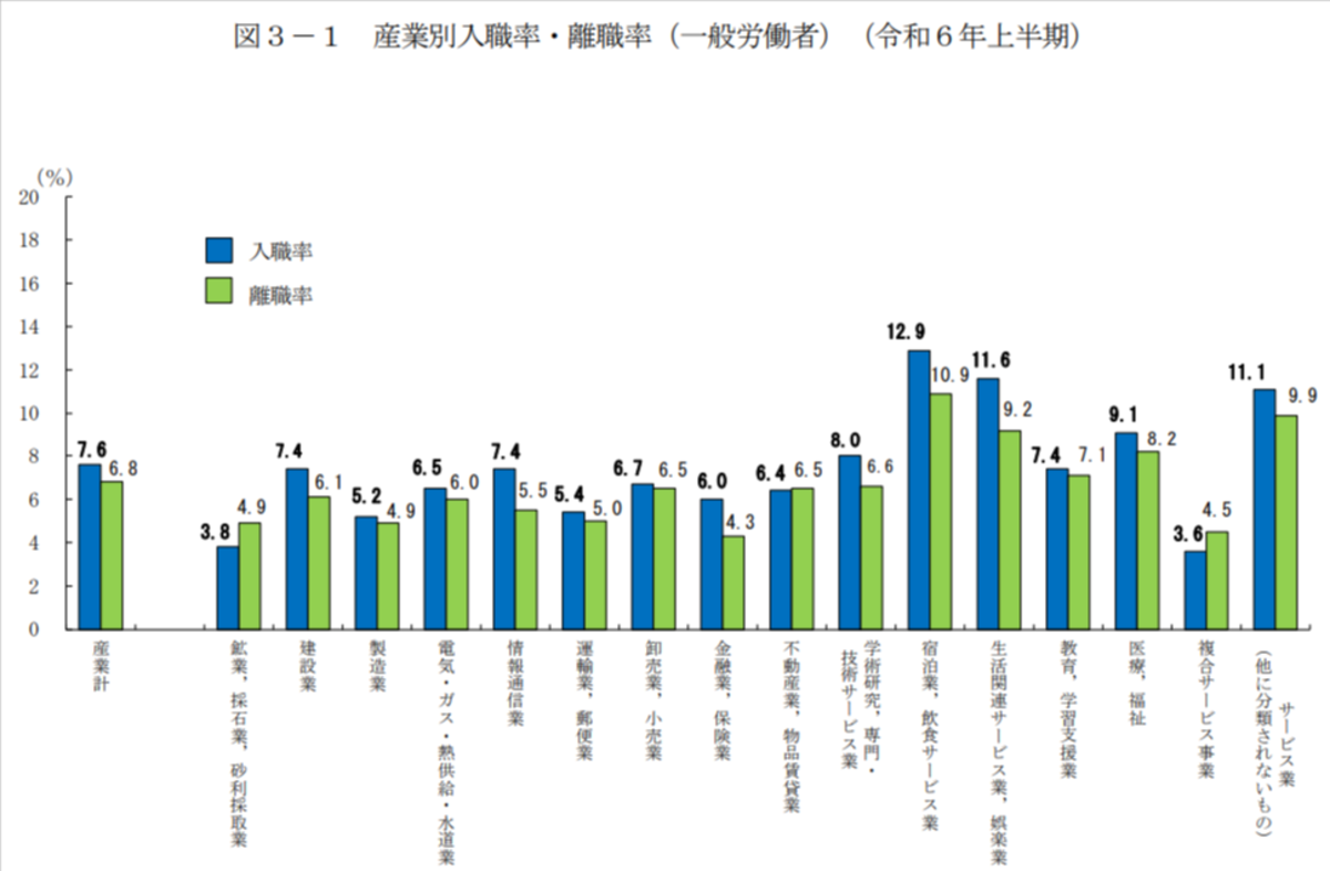 令和5年上半期の結果では、「不動産業,物品賃貸業」における離職率が入職率を上回っています。一方で、令和6年上半期の入職率が7.5%、離職率は7.1%という現状です。令和6年上半期は令和5年上半期と比べて離職率が低下していますが、入職者数そのものが低下しているとも読み取れます。