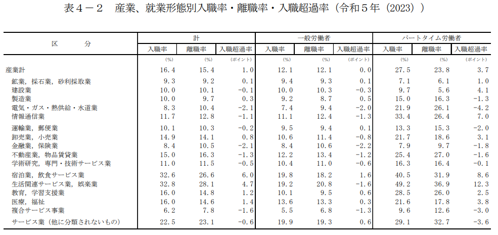以下は、令和5年に厚生労働省が調査した、産業、就業形態別入職率・離職率・入職超過率です。