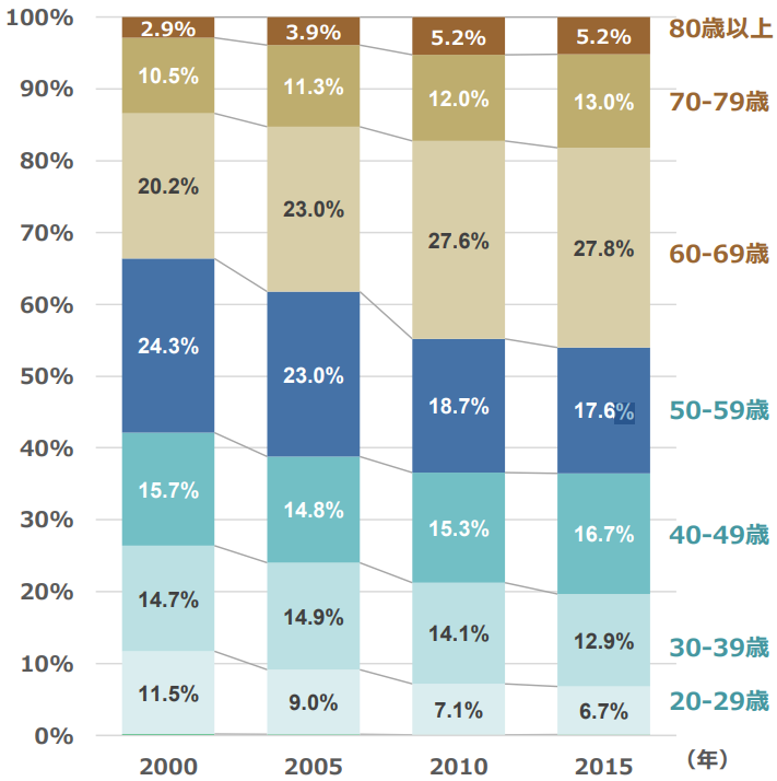 不動産業界では、若者が定着しにくい労働環境と、ベテラン層が長期にわたって活躍できる業界構造により、働く人の年齢が上がっています。