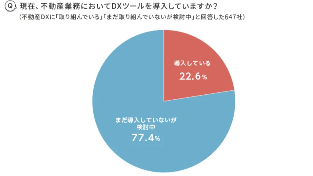 調査の結果、DXツールを導入している不動産会社は全体の22.6%にとどまっており、業界全体のデジタル化の遅れが目立ちます。