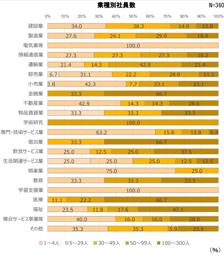 出典参照:ITユーザー企業におけるIT利活用に関する調査アンケート結果報告書(業種別・職種別集計編)2018年3月業種別社員数|厚生労働省