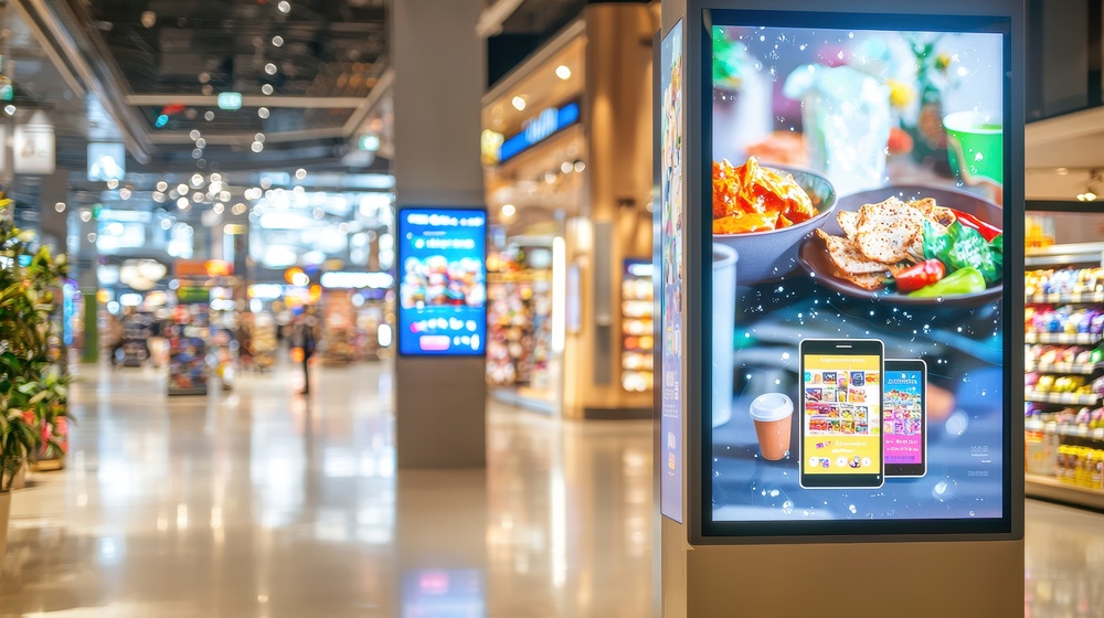 オフラインにおけるリテールメディアとして、近年急速に導入が進んでいるのが店頭のデジタルサイネージです。店舗の入り口や主要な通路、生鮮食品売り場、レジ横といった、来店客の目に留まりやすい場所に設置されたデジタルディスプレイに動画や静止画の広告を表示します。