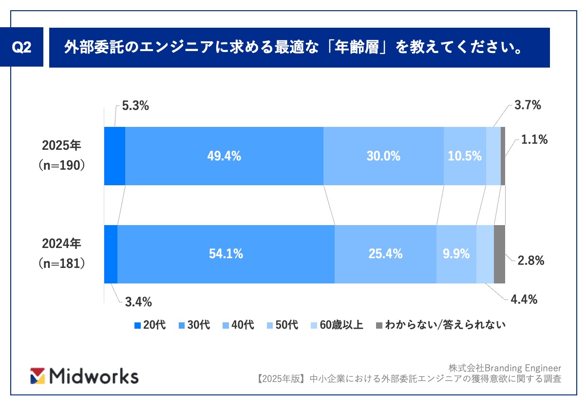 「Q2. Q1で「かなり意欲が高い」「やや意欲が高い」と回答した方にお聞きします。外部委託のエンジニアに求める最適な「年齢層」を教えてください。」(n=190)と質問したところ、「30代」が49.4%、「40代」が30.0%という回答となりました。