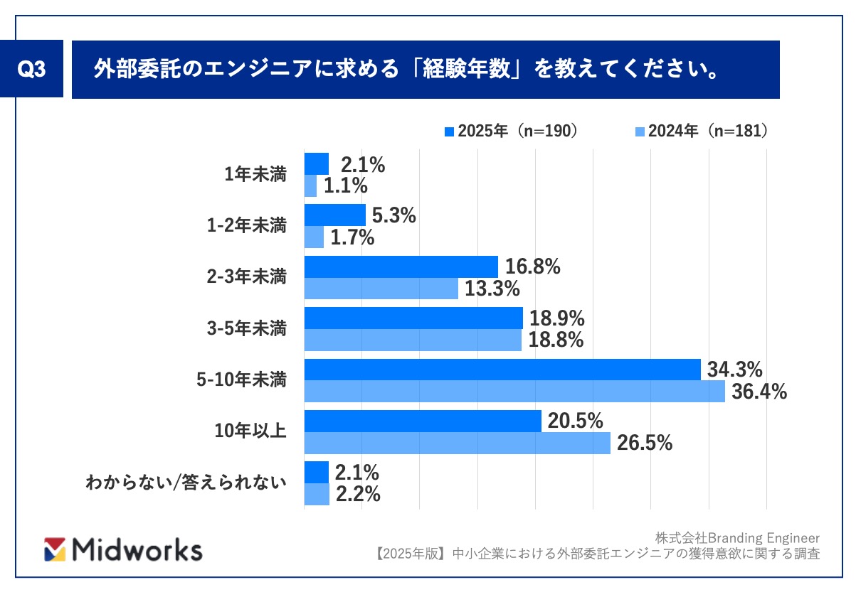 「Q3. Q1で「かなり意欲が高い」「やや意欲が高い」と回答した方にお聞きします。外部委託のエンジニアに求める「経験年数」を教えてください。」(n=190)と質問したところ、「5〜10年未満」が 34.3%、「10年以上」が 20.5%という回答となりました。